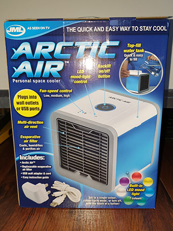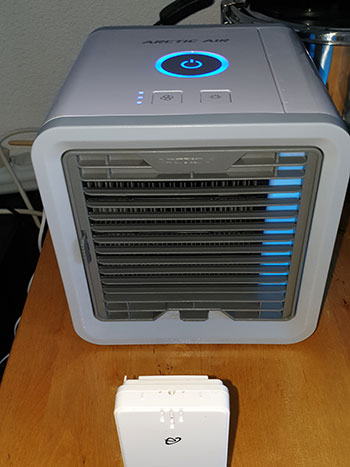 Dat was iets waar ik nog niet over had nagedacht. Wat omhoog gaat komt ook weer naar beneden natuurlijk. Gelukkig zat ik in de Makro folder te kijken en kwam ik daar de Arctic Air tegen. Dat is een luchtkoeler die werkt door water te verdampen. Hij werkt op een 5 Volt USB-aansluiting en er gaat ongeveer anderhalve liter water in. Maar voor ik hem ik de kast plaats eerst maar eens testen en kijken wat hij doet.