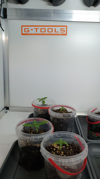 Boven: Op de linkerfoto hierboven zien we vier van de vijf Morning Glory’s. Rechtsboven zie je de Critical Orange Punch van Dutch Passion met daaronder Big Bud van Sensi Seeds. Tijdens het water geven is die laatste een beetje onder de aarde bedolven. Onder: Hieronder een overzicht van alle zaailingen in de kast. Zowel de vijfde Morning Glory als de Amnesia Auto laten zich nog niet zien.