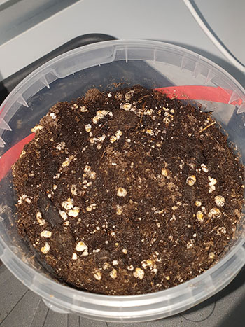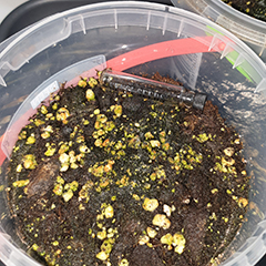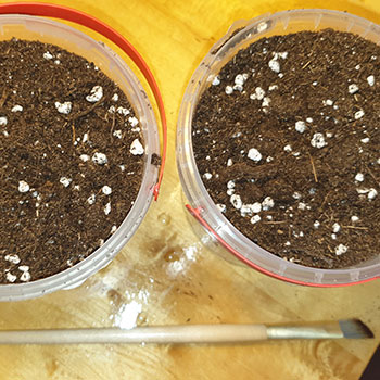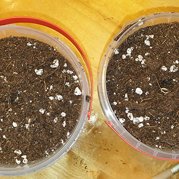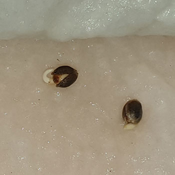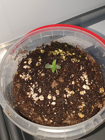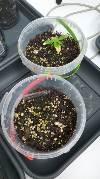 Onder: Twee uitgekomen White Choco Haze zaden. Ook deze plant ik weer in tomaten-emmers. White Choco Autoflower (rechts) laat ook een teken van leven zien en heb ik ook geplant. Ik maak daarvoor een klein kuiltje in het midden van ongeveer twee centimeter diep, doe het zaadje erin en veeg het gaatje dicht met een kwastje.
