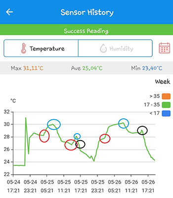 Ik heb de batterij van de Engbird ook vervangen zodat er weer meetgegevens zijn. Nu ik een paar dagen verder ben, lijkt de Arctic Air ook echt een effect te hebben op de temperatuur. In de linker grafiek van de temperatuur, is rood omcirkeld het punt dat de tank leeg is. In het blauw omcirkeld is de tank weer gevuld. De zwarte cirkels geven aan wanneer de binnenzon uit gaat.