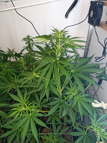 De plant in kwestie ziet er ook niet zo mooi uit als haar zusters. Na de knipbeurt van twee weken terug tellen de bladeren nog maar drie vingers per blad en ze is ook wat aan de dunne kant. Ik heb het vermoeden dat deze Mohammed dacht; ik word een autoflower. Of dit later problemen gaat opleveren (dat ze al in bloei staat en haar zusters niet) zullen we moeten afwachten. De Mohammed lijkt ook niet meer zo snel te groeien als twee weken geleden. Ik zal haar voorlopig dus nog even extra in de gaten moeten houden. De 315 Watt CMH kweeklamp heb ik nu 25 centimeter boven de dames hangen maar dat is wat aan de lage kant. Ik ga hem dus weer verhogen naar 35 centimeter.