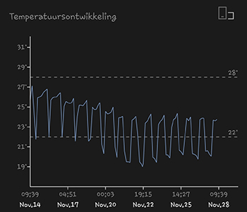 De gemiddelde luchtvochtigheid was daarbij 52,85 procent. Deze zien we in de grafiek ook erg snel stijgen. De komende dagen ga ik in de gaten gaan houden of het wel onder de 70 procent blijft. Ik wil namelijk geen schimmel, zoals je zal begrijpen.