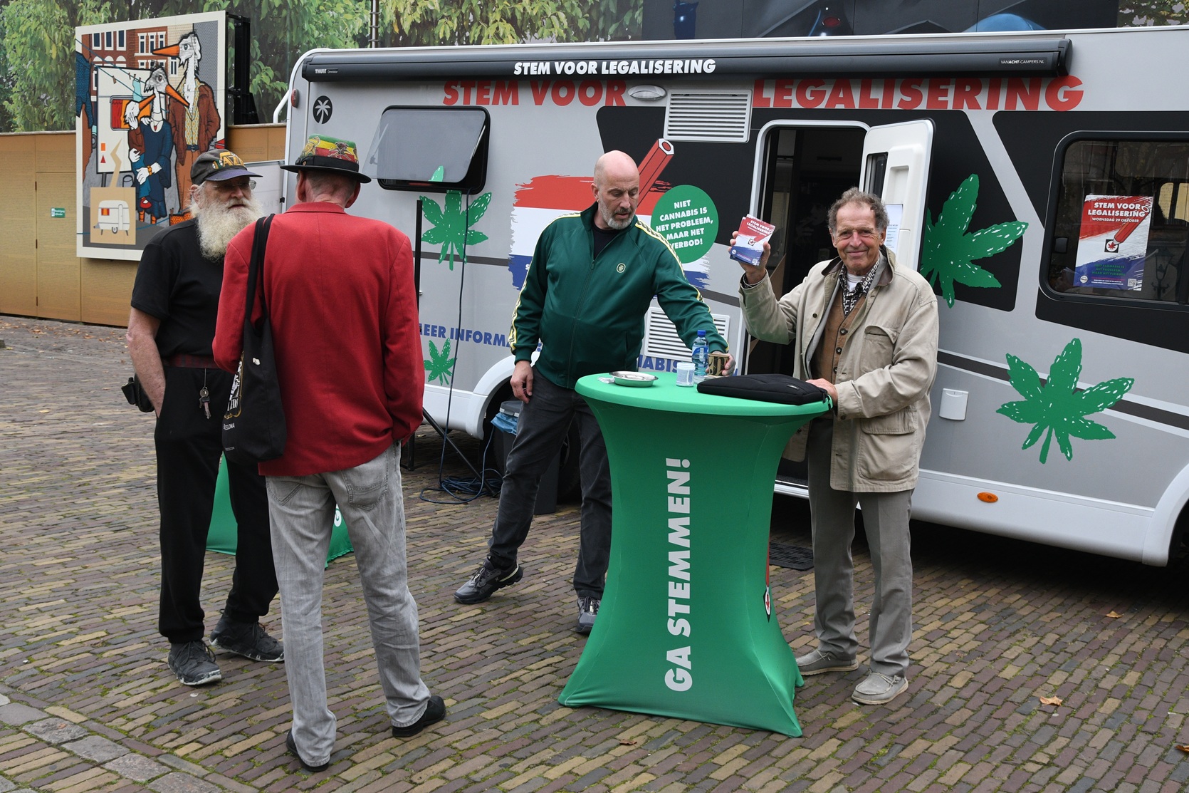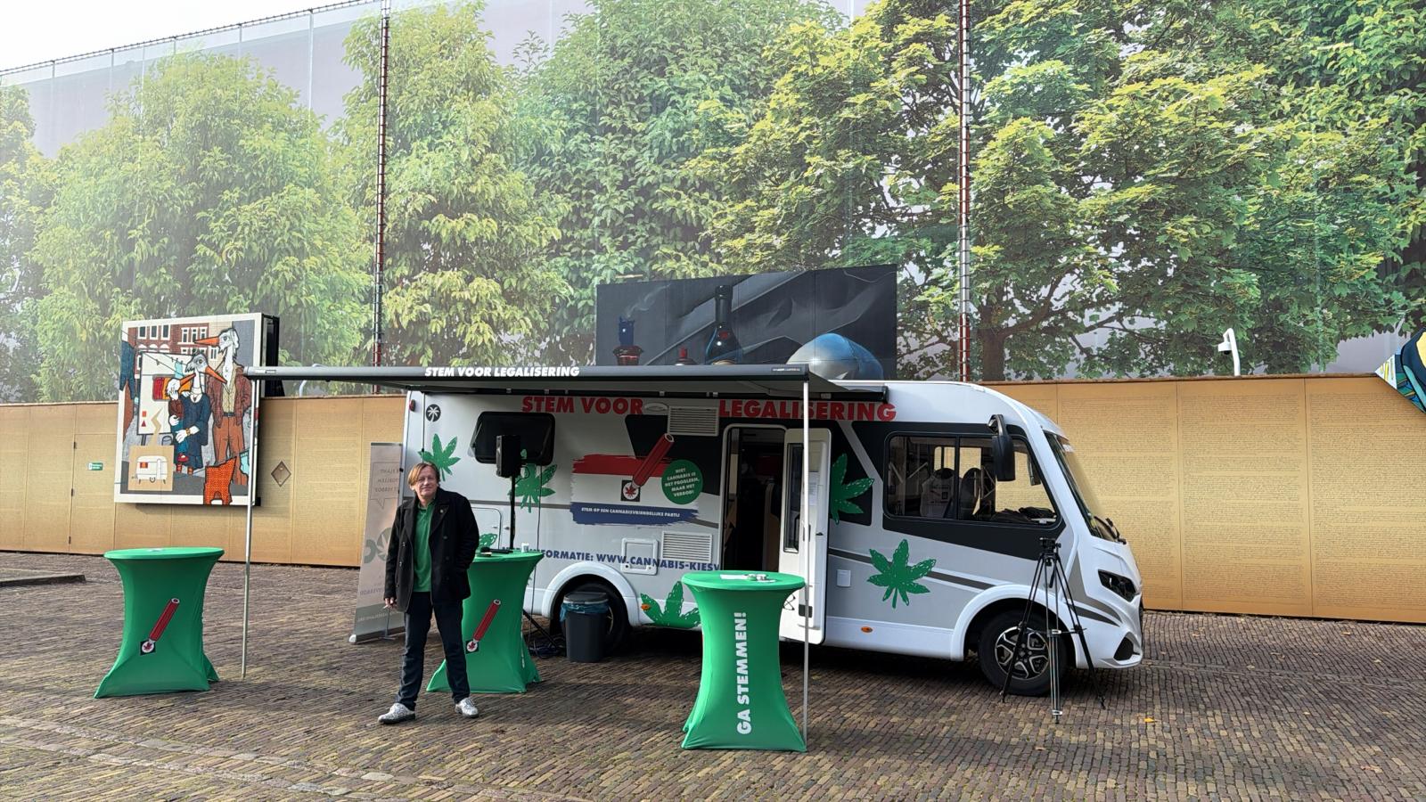 De CannaStembus op het Plein in Den Haag, waarbij drugsonderzoeker August de Loor de ‘Stem voor Legalisering’ flyer toont.