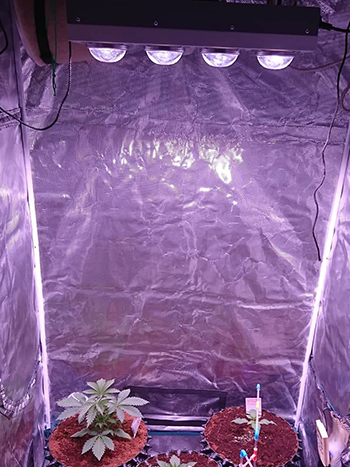 De vijf wietplanten worden verlicht door de Spectrolight Blast 400 LED kweeklamp. In het verleden heb ik goede resultaten behaald met de Starter 100. Het is een mooie uitdaging om te kijken of ik de 1.8 gram per Watt kan evenaren. Het zou geen gemakkelijke klus worden met het warme weer op komst.