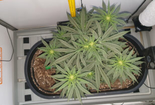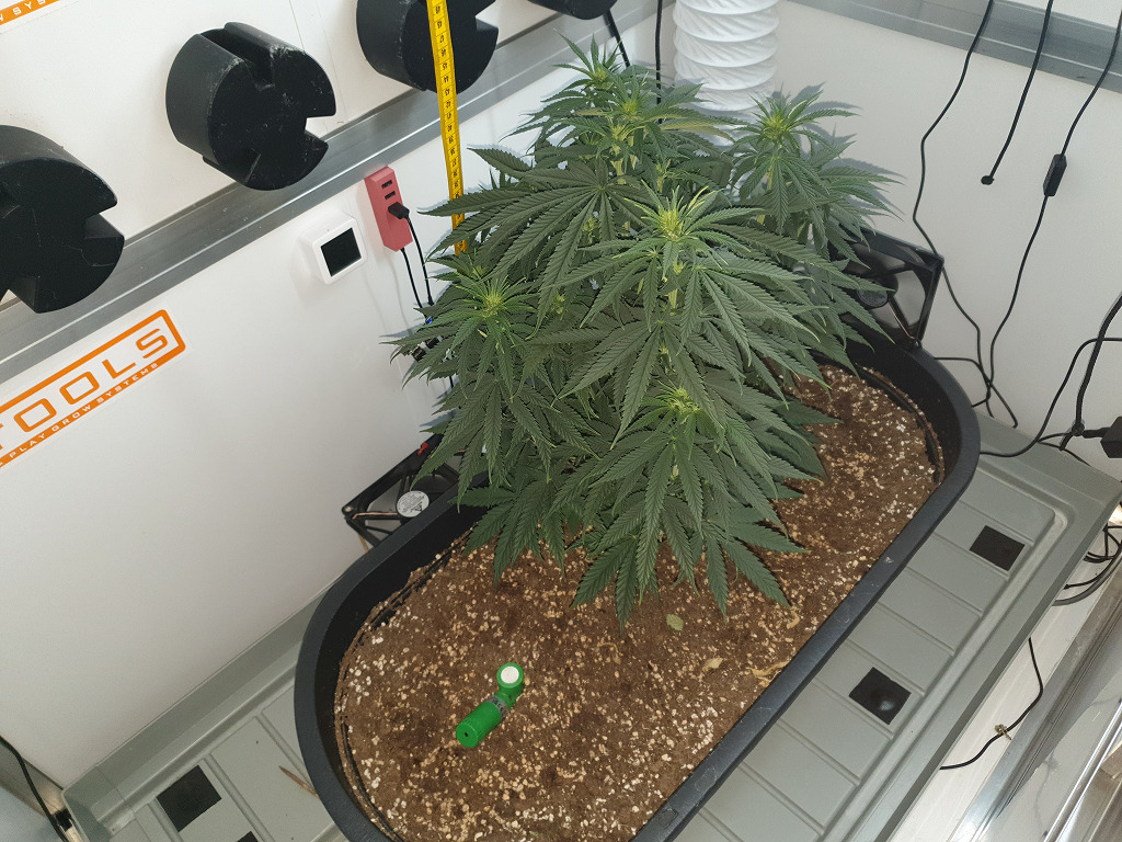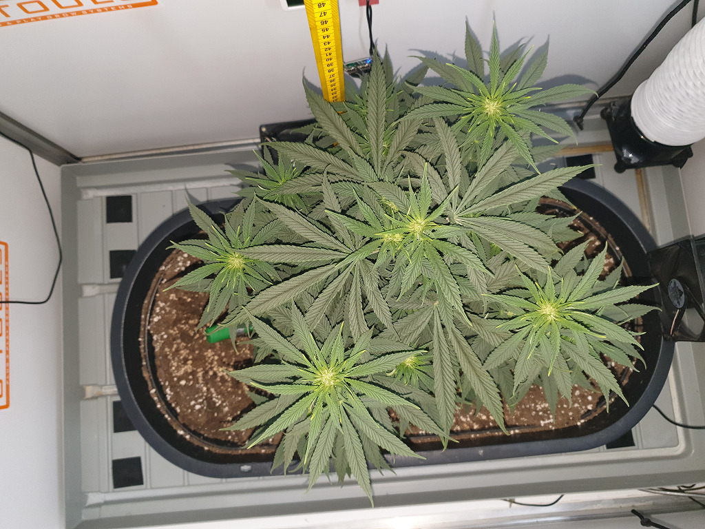 Deze Thunder Banana ziet er van alle kanten goed uit, en is 49 centimeter hoog. De twee 200 Watt SANlight EVO 3 LED’s heb ik gisteren iets dichterbij gehangen, van 45 naar 40 centimeter boven de plant. En sinds een week ben ik met Plagron Alga Bloom begonnen. Als we de wietplant van bovenaf bekijken, zien we dat ze nog een zee aan ruimte heeft in de kweekkast. Nou, als ik nu zo goed kijk, lijkt het er wel op dat de bloei elk moment kan beginnen.