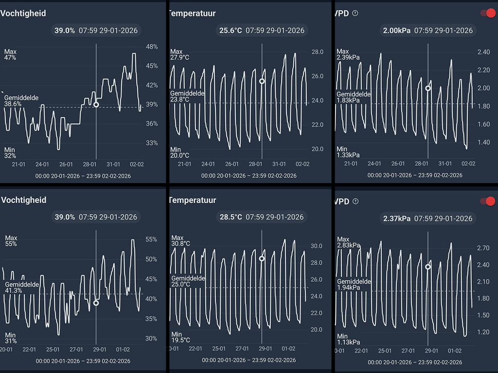 De gemiddelde temperatuur was de afgelopen twee weken 24,4 graden Celsius. De gemiddelde luchtvochtigheid was 39,95 procent. Deze is de afgelopen dagen iets aan het stijgen, en dat komt denk ik omdat de afzuiger van de kamer nog dicht stond, in verband met de kou. De gemiddelde VPD-waarde was 1,88 kPa.