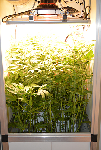 Na het weghalen van de bladeren heb ik de toppen die tegen de lamp groeiden aangepakt. De hoogste top heb ik eenvoudigweg afgeknipt. Ik doe dit niet graag maar we zitten nog aan het begin van de bloei en ik wil niet dat de lamp te hoog hangt voor slechts één top. Drie andere toppen die me te hoog waren heb ik gesupercropped. Dat gaf me de ruimte die nodig was om de kweeklamp weer wat te laten zakken. Hieronder zie je de na-foto’s van mijn pluk, knip en knak werkzaamheden.