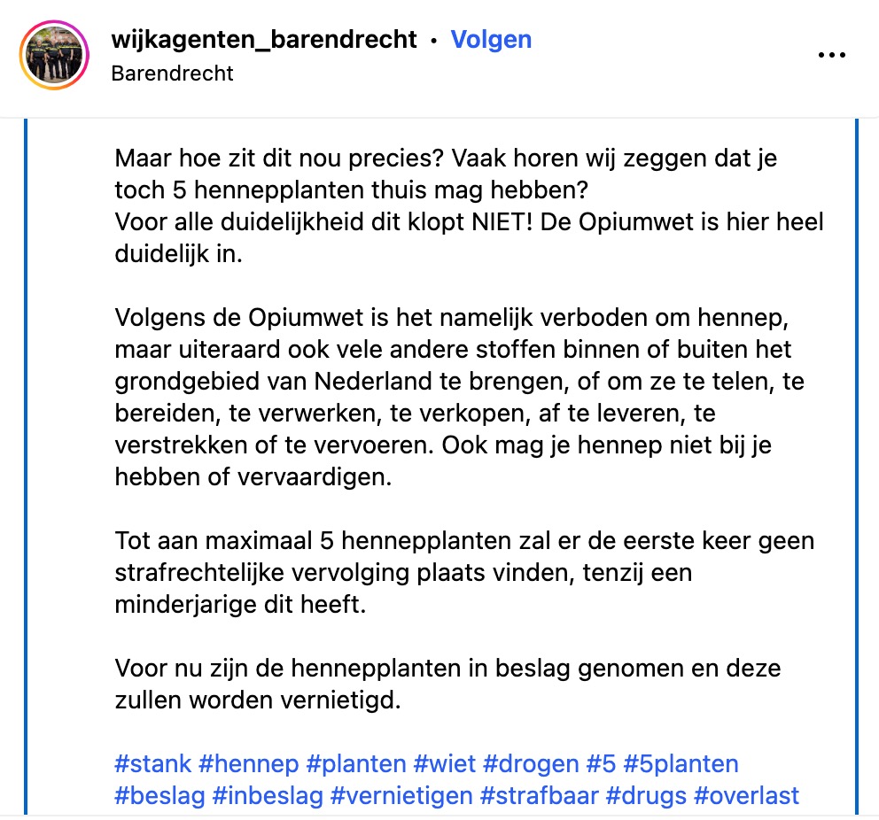 Met dat woord STANKOVERLAST, geheel in Donald Trump stijl door de wijkagenten Barendrecht in HOOFDLETTERS boven hun Instagram-post gezet, wordt het onbeschrijflijke leed dat de plantenvriend is aangedaan na de klacht over “een sterke henneplucht” verder uit de doeken gedaan.