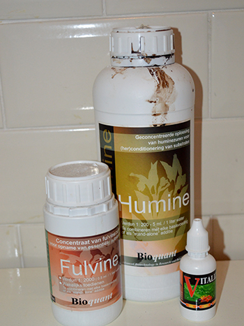 Hoewel de aarde nog nat genoeg was voor de planten, heb ik de wietplanten gister nog maar eens wat te drinken gegeven. Ik wil de aarde vochtig houden voor het bodemleven en voorkomen dat delen van de aarde uitdrogen. Deze keer heb ik er geen Bactrex of ander bodemleven aan toegevoegd, maar wel wat natuurlijke humuszuren van BioQuant die ik nog had liggen. Ook heb ik een paar druppels Vitalize van Mills meegegeven om de wietplanten in hun silicium behoefte te voorzien.