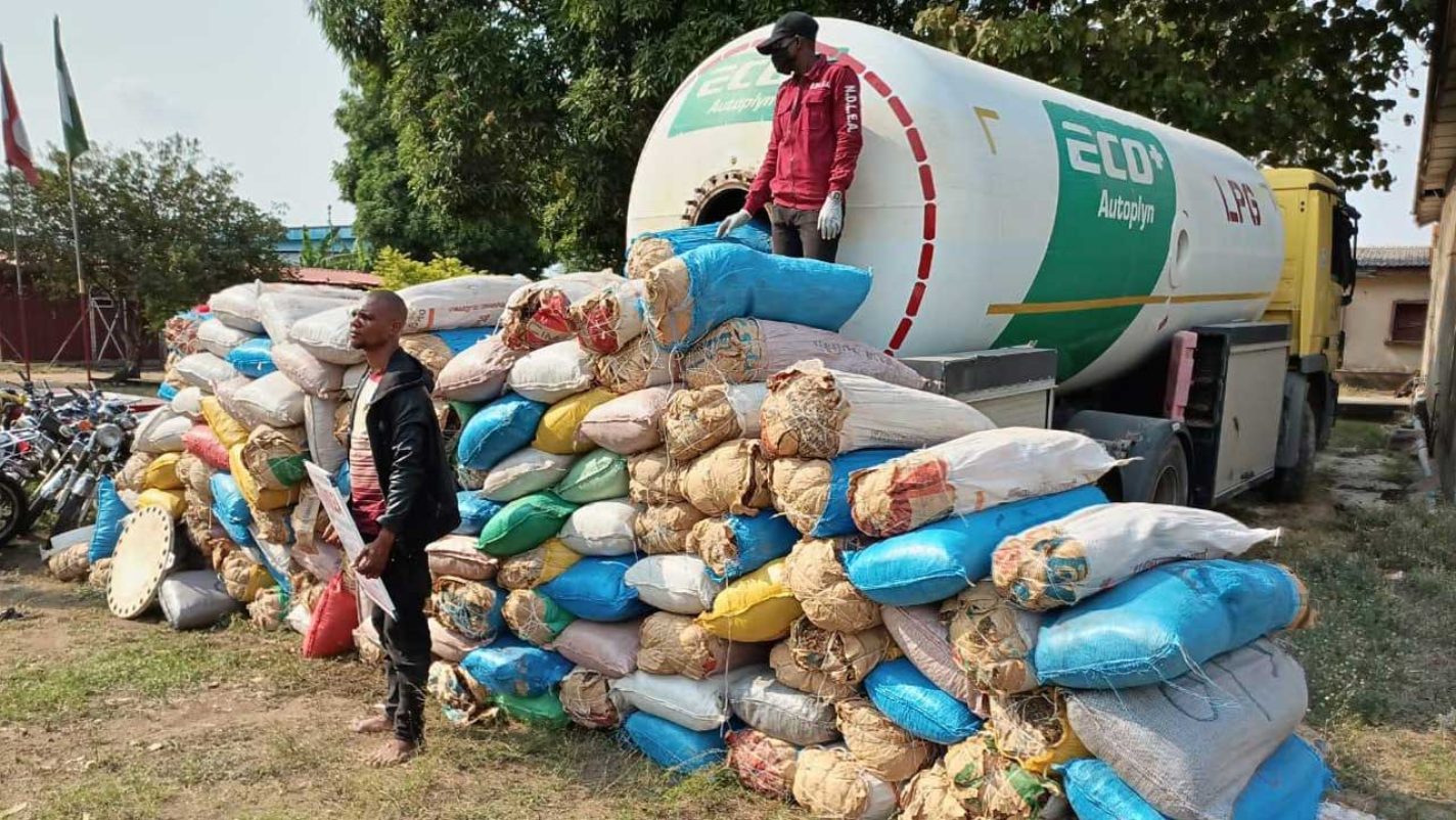 Wat zien wij hier? We zien een doodongelukkige (nemen we aan) Nnodu Azuka Kenrick, een theologiestudent die verplicht wordt te poseren voor de foto samen met zijn cannabishandeltje. Ook op de foto gezet door ijverige agenten van de National Drug Law Enforcement Agency in Nigeria is vrachtwagenchauffeur Oyoyo Mary Obasi, die het handeltje – bestaande uit 1.430 kilo wiet in 130 balen – naar het vliegveld moest vervoeren. Via Murtala Muhammed International Airport moest de geestverruimende handel naar het altijd gezellige Dubai. Dus misschien is het wel beter voor deze twee gasten dat ze al in hun thuisland gepakt én tentoongesteld zijn.