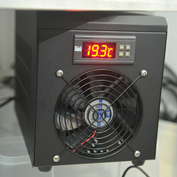 Na alles ingesteld te hebben zorgt deze koeler ervoor dat het voedingswater met dit warme weer mooi rond de 19 °C blijft. Tikt het de 20 °C aan, dan schakelt de koeler in. Hij kan echter ook verwarmen maar op dit moment is dat niet nodig. Ik heb ingesteld dat er verwarmd wordt als het water onder de 15 °C komt. De ideale temperatuur voor het voedingswater is tussen de 18 en 21 °C.