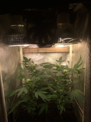 Voor de feestdagen gaf hij zijn recept voor het kweken op een oppervlakte kleiner dan een A4’tje en zelf doet hij het maar meteen voor. In zijn kaboutertentje staan dus vier kleine maar fijne Amneesjes (Amnesia Haze) te bloeien onder een paar spaarlampen. Microkweken in optima forma dus met Elmo.