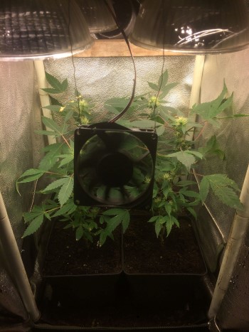 Bij mijn laatste update gebruikte ik nog maar twee spaarlampen (23 Watt per stuk) voor de vier jongedames. Ik heb dat nu uitgebreid naar vier spaarlampen zodat de planten nu in totaal 92 Watt aan licht krijgen. Dat heeft alleen wel weer gevolgen gehad op de warmte in de kleine tent zodat ik er een extra ventilatortje heb bijgeplaatst. Alles bij mekaar is het dus best een drukke bedoening daar in dat kleine tentje nu.