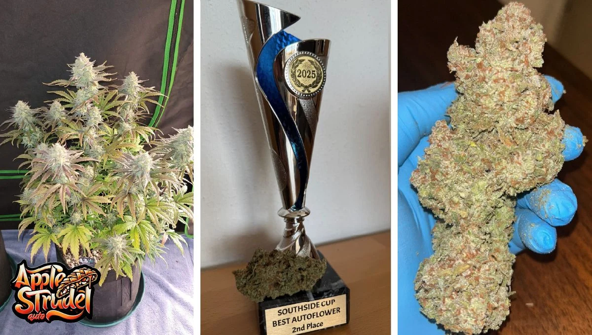 🏆 Winnaar Southside Cup 2025 – Apple Strudel Auto werd in 2025 de tweede beste autoflower op de Southside Cup in Stuttgart, Duitsland. 85 kwekers namen deel met hun beste planten – en de Apple Strudel ging er met de hoofdprijs vandoor. Voor een eerste overwinning van de kweker die haar inzond, was het ook nog eens een bijzonder moment.