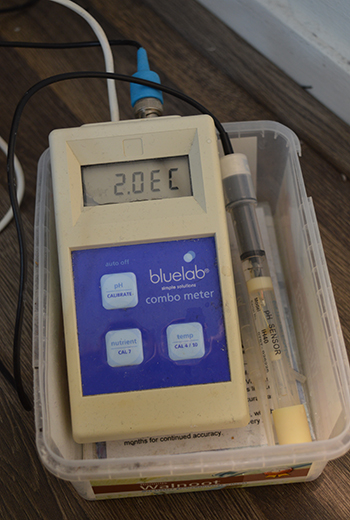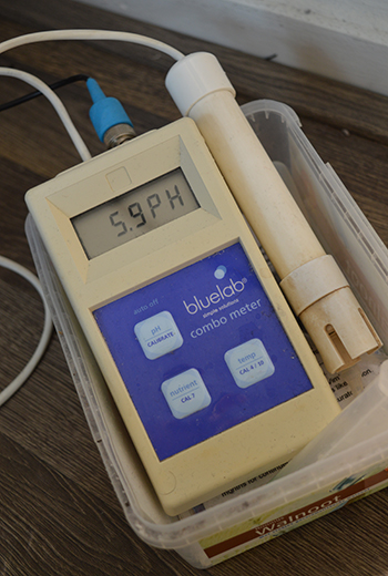 Op de foto zie je trouwens een EC-waarde van 2,0 staan maar dat is omdat ik de voeding net had toegevoegd. De pH-waarde heb ik op 5,8 afgesteld met wat pH-min van Plagron. Ook hier zie je een andere waarde op de foto omdat ik het vlak daarvoor heb toegevoegd.
