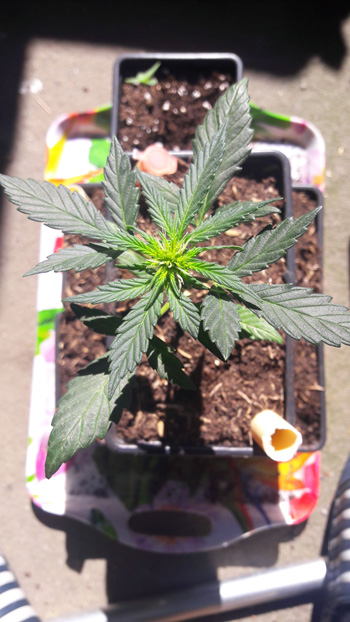 Ik ben dit seizoen al lekker vroeg begonnen maar dat is meer voor de lol. Het beste kun je autoflowers toch gewoon midden mei zaaien. Ik heb met kleine moestuinpotjes (P9) en een lijmpistool een creatie gemaakt voor de Hindukush Autoflower. Ik wist al dat deze autoflower erg klein zou blijven, dus een enorm grote pot was niet aan haar besteed. Het zijn uiteindelijk zes moestuinpotjes geworden, dus 3 liter bij elkaar. Zoals je kunt zien is de Hindukush erg klein. Ze staat nu zes dagen in bloei; als ik er één rokertje vanaf kan halen dan ben ik al een blij man.