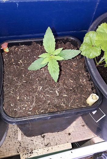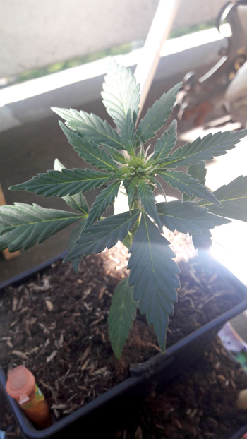 In een 7-literpot staat de Sour Diesel Haze Autoflower. Deze is nog erg klein en groeit wat traag, ik hoop dat ze nog wat wil groeien voordat de bloei begint. Ik geef deze plant nog geen voeding maar gewoon kraanwater, afgezuurd naar een pH-waarde van 6.