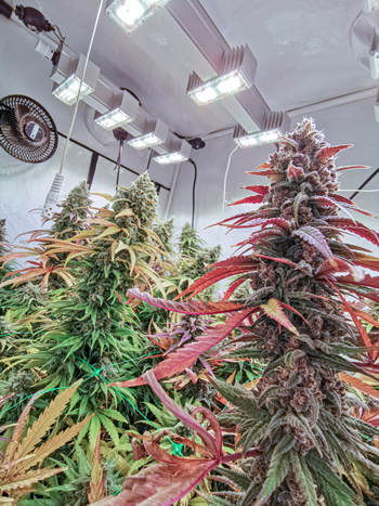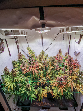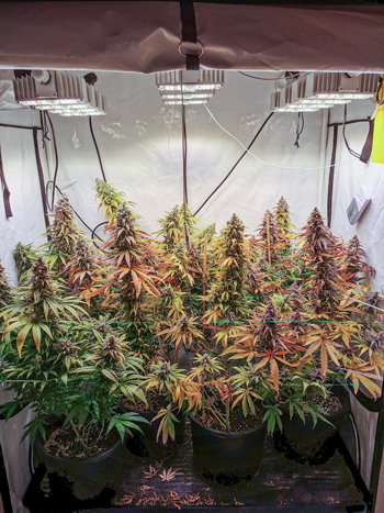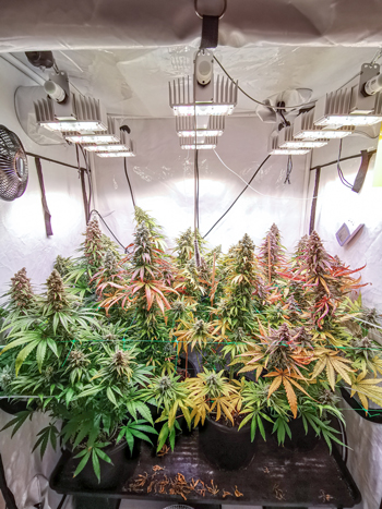De 8 planten vullen de hele oppervlakte van mijn Homebox Ambient R120 groeitent, en zijn tot een hoogte van gemiddeld 80 centimeter gekomen. Ze hebben mooie donkergroene bladeren maar die beginnen nu wel steeds meer rood en paars te verkleuren, aangezien mijn vrouwtjes verder afrijpen. De twee netten houden de takken overeind en geven stabiliteit. Daarmee kunnen de planten al hun energie voor de productie van de toppen gebruiken.
