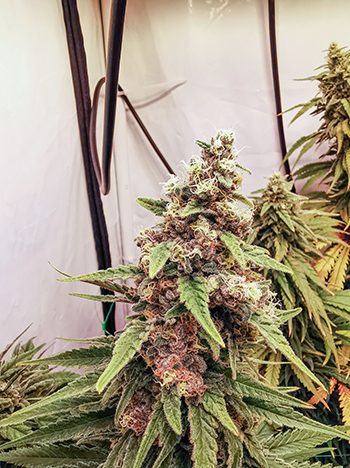 De mooie groene kleur van de bladeren en de ongelooflijk mooie dikke en paarse buds, laten zien dat de planten heel gezond zijn. De BioTabs voeding evenals het spectrum en de sterkte van het licht zijn perfect voor hun ontwikkeling. De twee SANlight Q4W-Gen.2 LED-lampen aan weerszijden van de tent branden op 100% van hun vermogen, en hangen op 40 cm afstand boven de toppen van de planten. De extra lange Q3WL-Gen.2 in het midden van de tent is gedimd op 80% en hangt ook op 40 cm afstand.