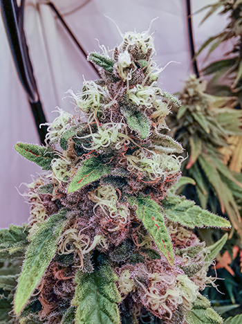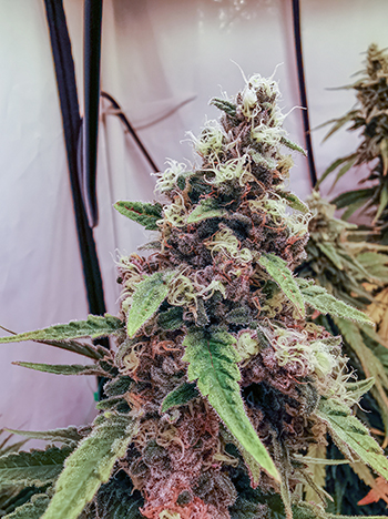 De Banana Krumble (oftewel Banana Punch x OG-Kush) van Green House Seeds groeit fantastisch! De buds krijgen al een duidelijke paarse kleur en zitten boordevol met trichomen. Alle zijtakken en ook de hoofdstammen hebben nu vette cola’s; het zijn harde en compacte toppen. Ze glinsteren in het licht van de flits als ik een foto in het donker neem en het ziet er bijna uit als kleine sterren in een groen universum… geweldig!