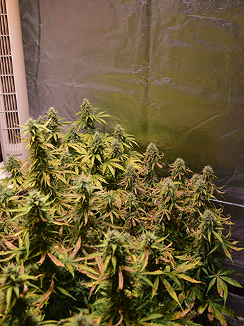 De HPS Killer ledlamp staat sinds het begin van de bloeifase vol aan, met zowel de groeistand als de bloeistand ingeschakeld. Er komt een mooi warm licht vanaf maar omdat de bladeren al zwak zijn, verbleken ze wanneer ik de lamp te dicht op de planten hang. Hij hangt dus op de hoogste stand wat ook niet echt bijdraagt aan een maximale oogst.