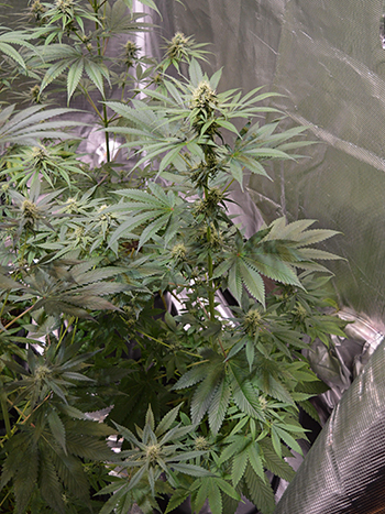 Omdat de planten nu vol in bloei staan heb ik de ‘HPS Killer’ ledlamp ook vol aangezet. Hij hangt 50 centimeter boven de planten en het ziet er goed uit. Onderin groeien wat vergeelde bladeren maar dat heeft aan de ventilator gelegen. Het is niet de ideale ventilator voor wietplanten dus ik zoek op Marktplaats naar een andere.