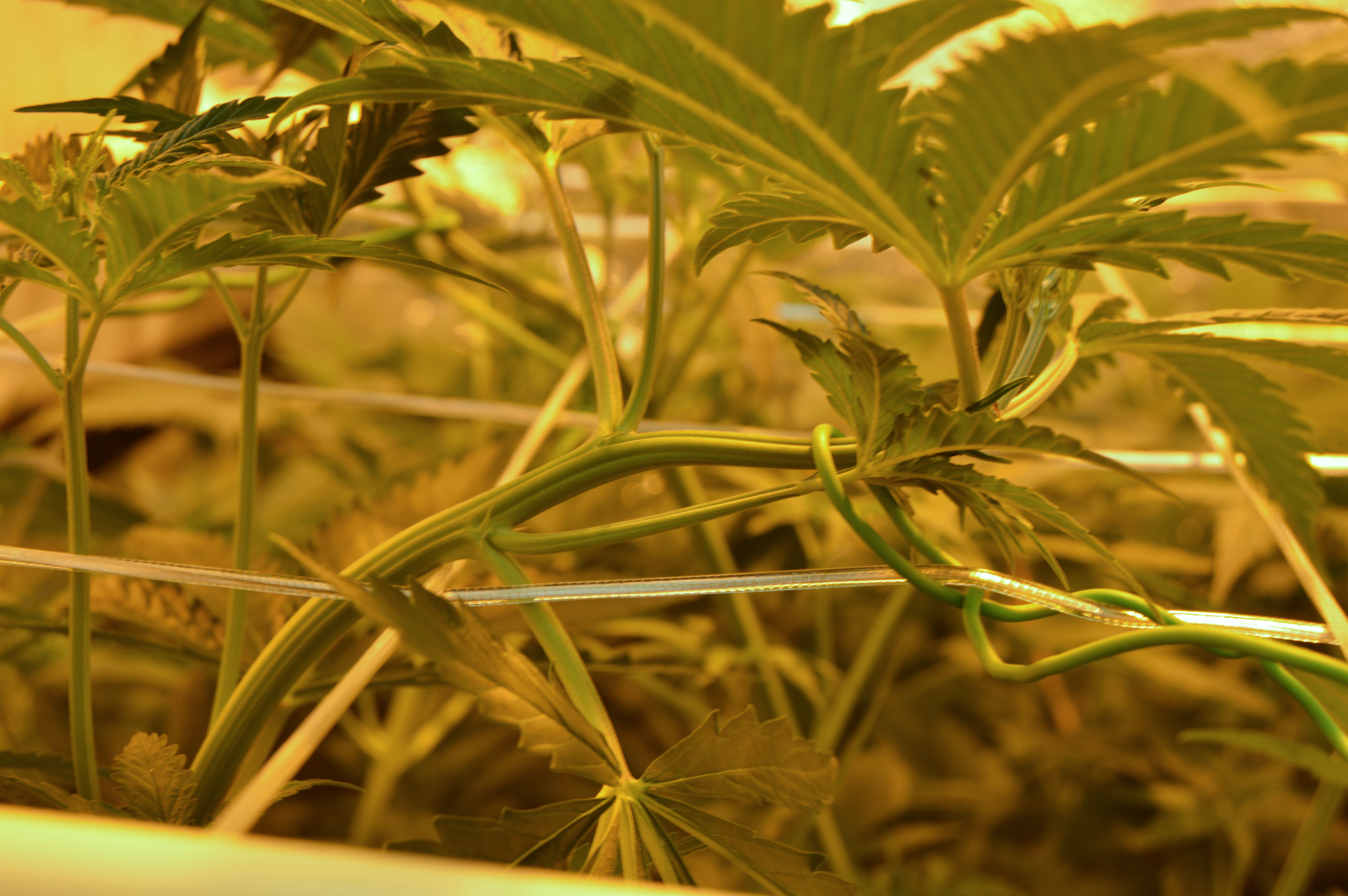 Ik moet, wanneer ze op het 12/12 lichtregime staan, nog wel twee weken doorgaan met het behandelen van de Medical Kush met het zilverwater. Als het dan goed is moeten we mannelijke bloemen gaan zien binnenkort. Ik ben benieuwd. Ik heb een bevriende kweker gevraagd om het scroggen een keer voor te doen want ik ben altijd bang dat ik de plant beschadig. Als je er op tijd bij bent kan je ze rustig door het rek dirigeren en krijg je een heel mooi effect.