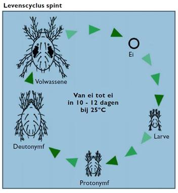 De stadiums worden steeds onderbroken door een rustfase. Tijdens die rustfasen ligt de mijt onbeweeglijk op het blad. Zodra de mijt volwassen is, duurt het nog een halve dag tot 3 dagen voor de vrouwelijke exemplaren weer eieren gaan leggen. De totale cyclus van ei tot volwassen spintmijt duurt bij een temperatuur van 30 graden zo’n 7 dagen. Is het 20 graden dan doet de spint er 17 dagen over, en 36 dagen bij 15 graden. Warmere temperaturen versnellen het proces aanzienlijk!