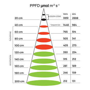 Deze waarde wordt gemeten in micromol per seconde (μmol/s). En nu terug naar de Spectro Light Blast 400 die ik gebruik, deze heeft bij wijze van voorbeeld een totale output (PPF) van 812 μmol/s. PPFD is diezelfde straling, alleen dan gemeten per vierkante centimeter oppervlak dat bestraald kan worden door de lamp. Een laserstraal is bijvoorbeeld heel sterk en straalt veel fotonen uit. Maar dit licht valt slechts op een heel klein oppervlak, niet groter dan een puntje als je het op een muur schijnt. Daar kan je geen plant mee kweken. De spreiding van het licht uit de lamp en hoe ver het reikt zijn daarom ook belangrijke factoren.