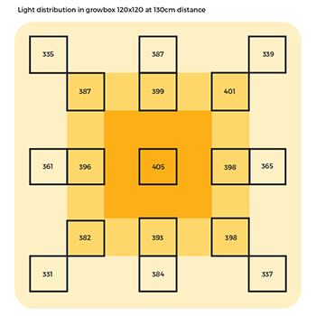 In de rechter grafiek word daarom aangegeven hoeveel μmol/s aan opneembaar licht (PAR), er precies gemeten wordt op 120×120 oppervlakte als de lamp op 130cm hangt. De lamp hangt in het midden van de ruimte dus in het midden zijn de waardes hoger dan aan de randen.