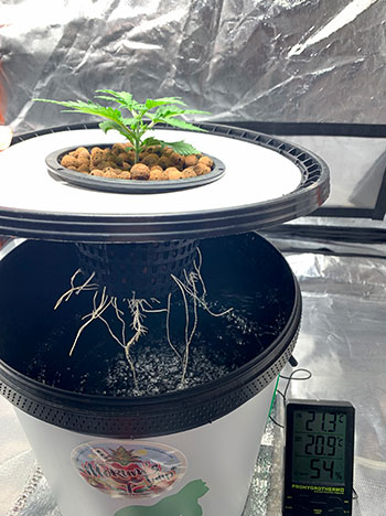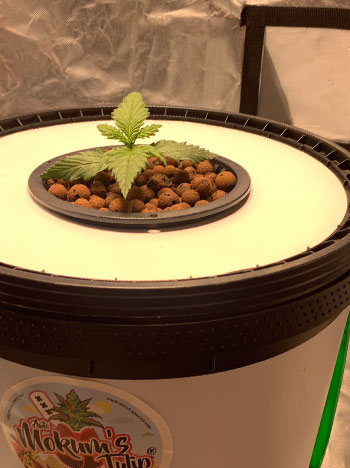In het vorige verslag stond ze nog in de DGS, maar inmiddels is ze verhuisd naar een iets grotere netpot in de Growrilla DWC-emmer. Het is natuurlijk niet top om je jonge plantje nog uit een netpot te peuteren, maar zo heb ik wel mooi een stukje efficiënt voor kunnen groeien. Na het ontkiemen van deze Auto Mokum’s Tulip heb ik expres een netpotje van G-tools gebruikt met een wat grotere maaswijdte. Ik heb wat grote hydrokorrels geselecteerd zodat ze in het potje bleven en weer gemakkelijk te verwijderen zouden zijn.