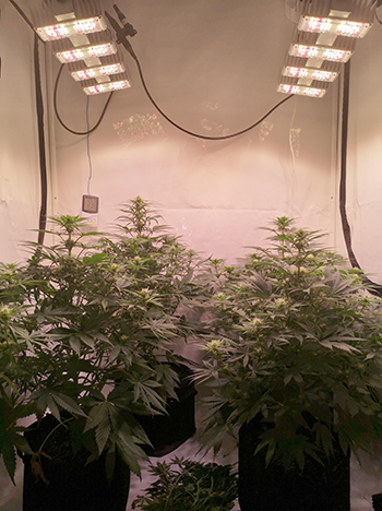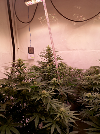 In de eerste vier weken zijn de vier planten mooi gegroeid en hebben ze de tent voldoende opgevuld. Daarom schakel ik nu over naar de bloei. Om dit te bewerkstelligen heb ik de timer omgeschakeld op een nieuw dag- en nachtritme. Ik plaats van 18 uur licht en 6 uur donker die de planten in de groeifase kregen, geef ik ze nu nog maar 12 uur licht en 12 uur donker. In de langere donkere nachten maken de planten meer en meer bloeihormonen aan, tot ze uiteindelijk ook echt met bloeien beginnen.
