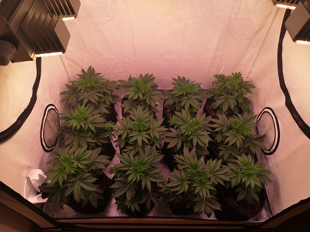 De planten blijven mooi aan het groeien in week 7, en nu zijn al de eerste witte kroontjes te zien. Dat zijn clusters van vrouwelijke bloemen, wat betekent dat de bloei nu echt in gang is. De LED-lampen heb ik op deze moment gedimd naar 80% en hangen op 70 cm afstand van de planten. Binnen een week na het uitlichten hebben de planten de hele tent weer opgevuld, het is geweldig om te zien!