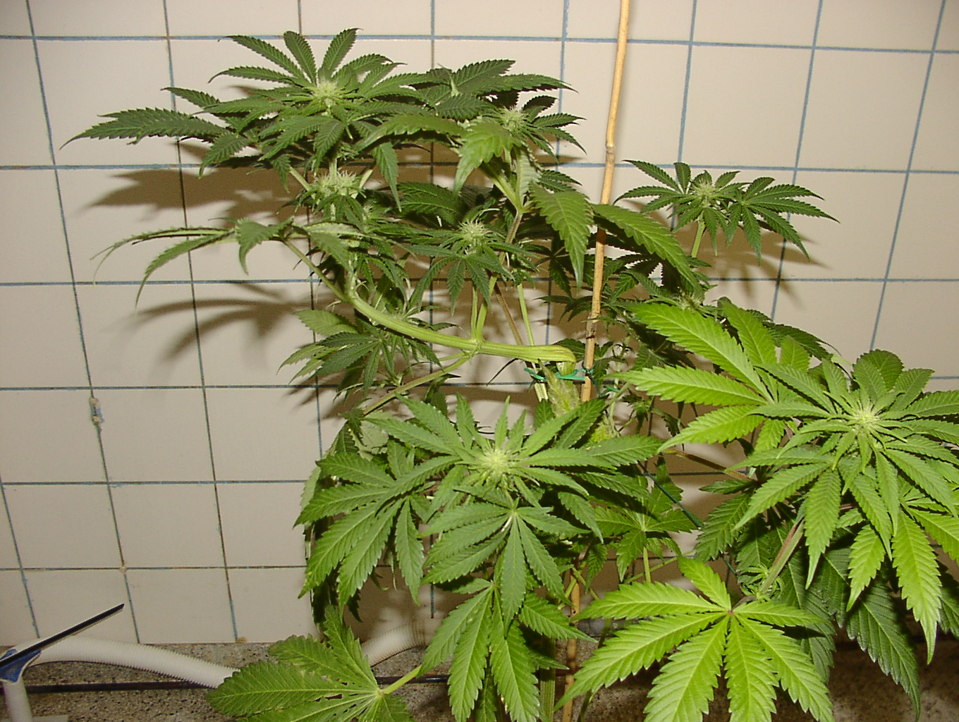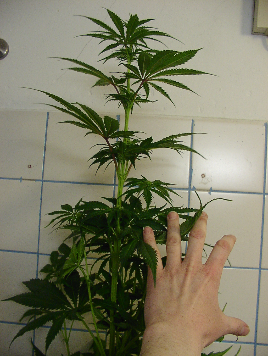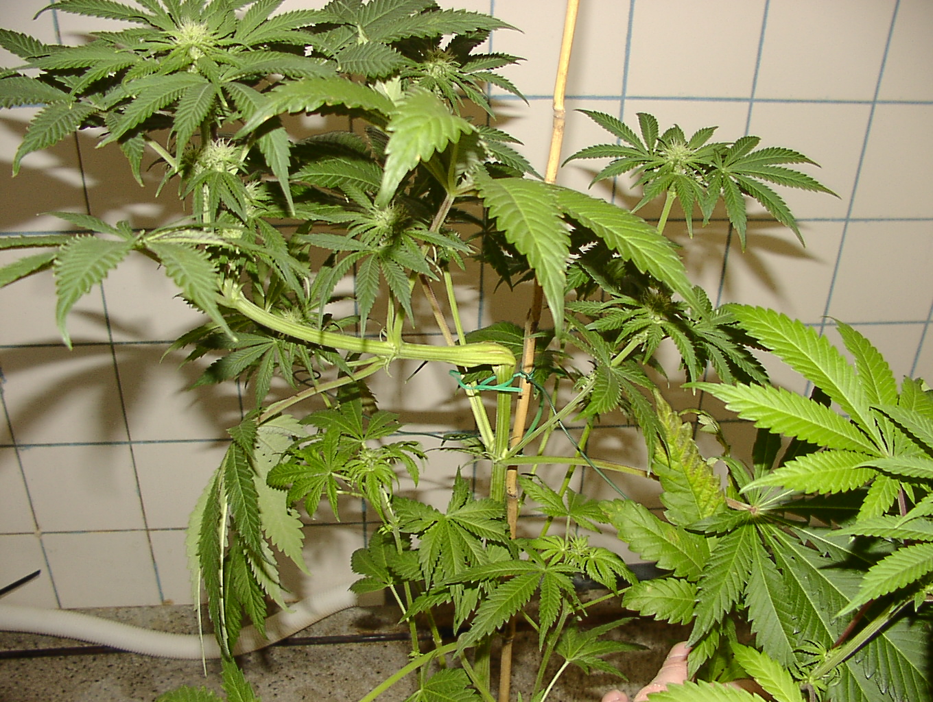 Deze 90 centimeter grote plant heb ik gesupercropped. Dat betekent: de hoofdstam gewoon op 20 cm onder de top van de plant indrukken rondom en dan de hele stam ombuigen tot hij naar beneden kijkt. Daardoor gaan de zijtakken sterker groeien omdat de hoofdtak zich eerst weer moet herstellen. Daarmee voorkom je dat de plant veel te hoog wordt. Je verliest de hoofdtop er bovendien niet mee. Dat in tegenstelling tot bij het toppen (=hoofdstam afsnijden onder de bovenste internode). Inmiddels heeft de hoofdtak zich weer prachtig hersteld en is in een boog weer naar boven gegroeid.