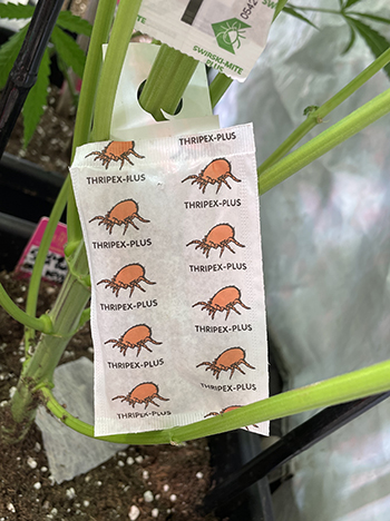 Ik zou ook gif kunnen sproeien tegen de tripsen, maar dat wil ik niet. Helemaal niet omdat ik al veel buds heb en het gif daarop achterblijft. Dan kan ik de wiet na de oogst niet meer als medicijn gebruiken. Om dat te voorkomen moet ik de plaag dus op biologische manier bestrijden, en dat doe ik met roofmijten van Koppert. Ik bestel de ‘Swirski-Mite Plus‘ en de ‘Thripex-Plus‘ roofmijten; beiden zijn geschikt tegen tripsen. De mijten worden geleverd in zakjes die je direct op de plant hangt, bij voorkeur op een zijvertakking van de hoofdstam (zie foto’s). Van daaruit kunnen ze uit de zakjes klimmen en verdelen ze zich over de hele plant en vreten ze alle tripsen op.