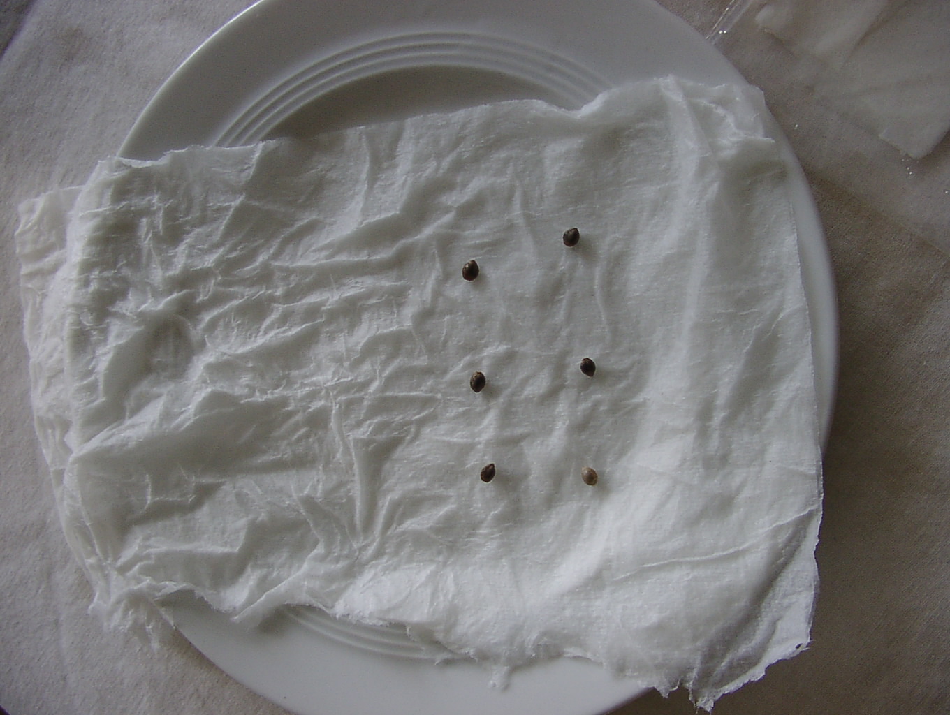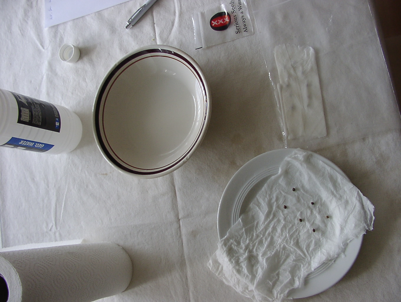 Op een helft van dat keukenpapier worden de zaden van een soort gelegd, op een afstand van ongeveer 2 cm van elkaar. Dan wordt het papier dichtgevouwen. Het dichtgevouwen keukenpapier komt in een hersluitbaar plastic zakje en wordt den in het donker opgehangen (ik doe dat met plakband aan de binnenkant van een kastdeur).