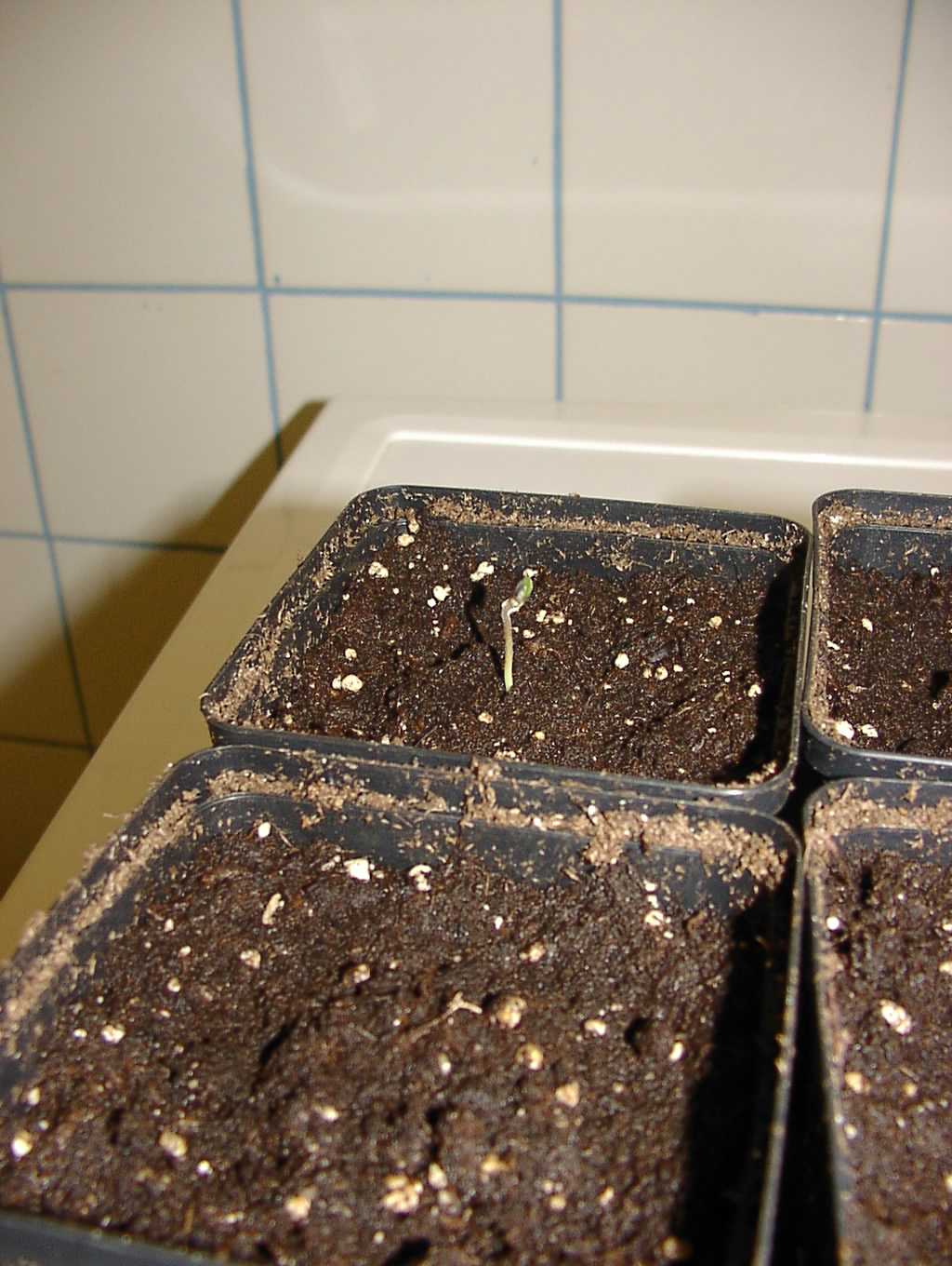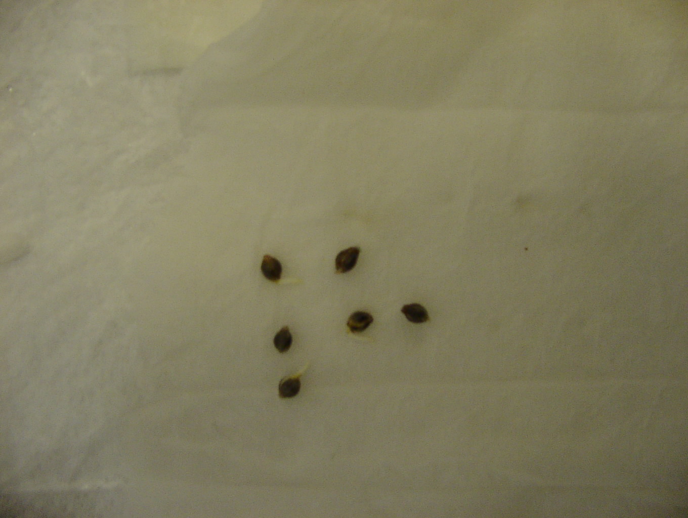 Na 48 uur heb ik de zakjes geopend, en het keukenpapier opengevouwen om te kijken hoeveel zaden ontkiemt waren. Ik was echt positief verrast, dat ALLE zaadjes ontkiemt waren. De helft al met een worteltje van zo’n 10 mm, deze heb ik vast in potjes met aarde geplaatst. De rest heb ik in het keukenpapier gelaten. 48 uur later waren ook deze zaden klaar om in potjes overgezet te worden.