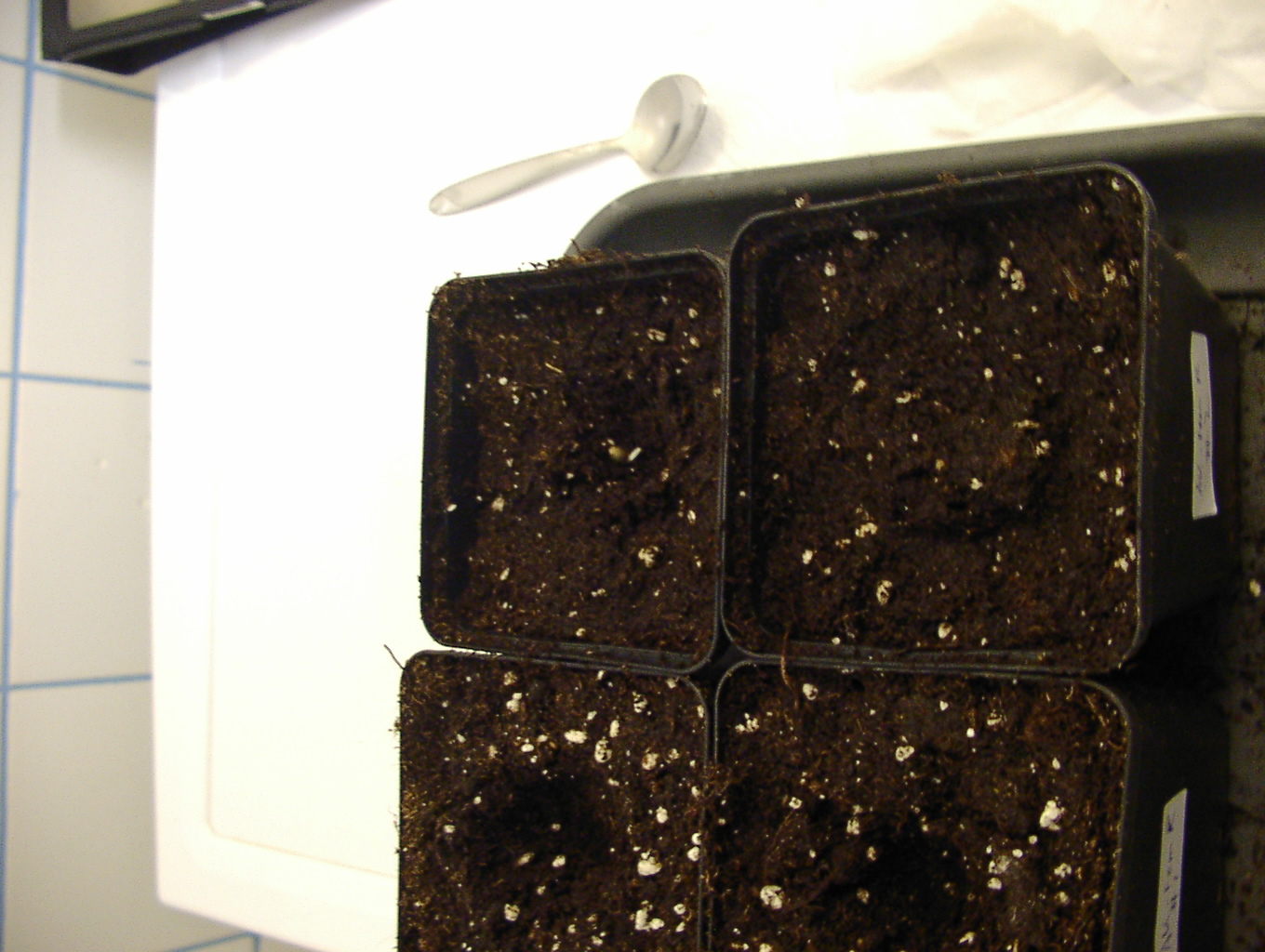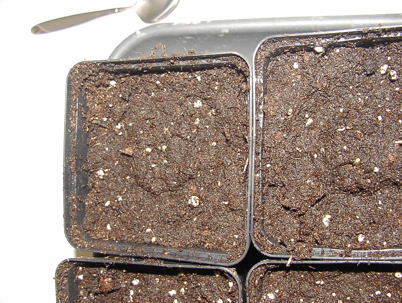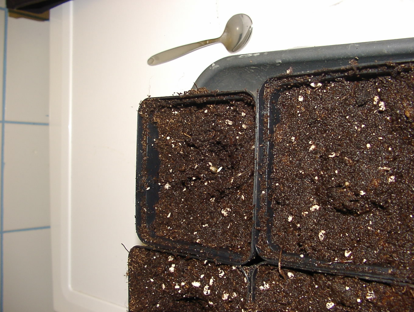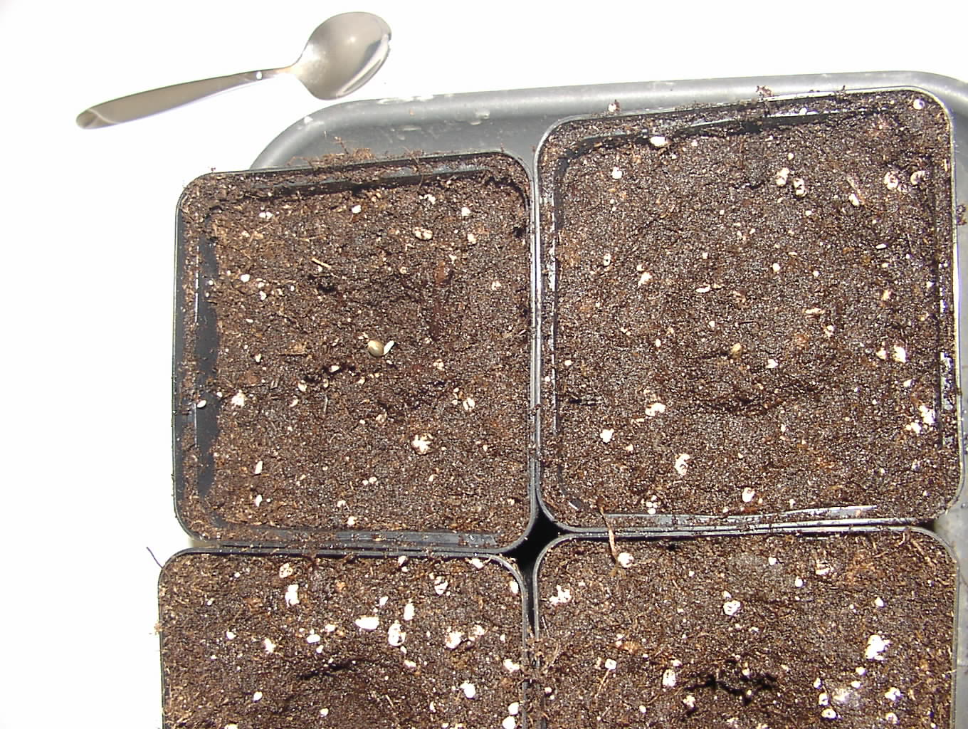 In de goed vochtig gemaakte aarde maak in een klein kuiltje (altijd diep genoeg voor de wortel van het zaadje dat daarin moet) en daar leg ik voorzichtig het ontkiemde zaadje met een lepel daarin en druk dan de aarde voorzichtig aan zodat het kuiltje weer gevuld is. Daarme is de eerste stap gezet en kunnen de ontkiemde zaden tot zaailingen uitgroeien.