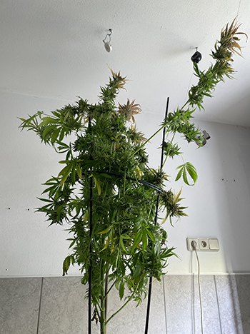 Voor de oogst neem ik iedere pot uit de Homebox groeitent en haal ik eerst alle bladeren eraf die groter zijn dan mijn duimnagel. Daarna wordt de plant bij de hoofdstam en net onder de laagste vertakking, afgesneden. Ik hang hem daarna ondersteboven op, in de leeggehaalde tent om te drogen. De lampen en de ventilator in de tent zet ik dan uit, en ik laat alleen de afzuiger aan.