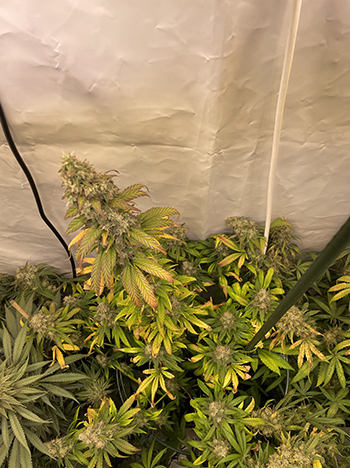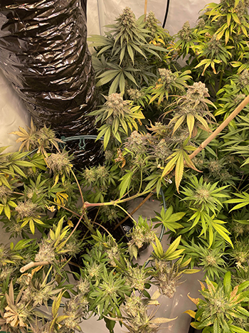 Voor de oogst neem ik iedere pot uit de Homebox kweektent en haal alle bladeren eraf die groter zijn dan mijn duimnagel. Daarna wordt de plant op de hoofdstam net onder de laagste vertakking afgesneden, en dan ondersteboven opgehangen. Ik laat ze in de leeg gehaalde kweektent drogen. De lampen en de ventilator staan uit en alleen de afzuiger staat nog aan.