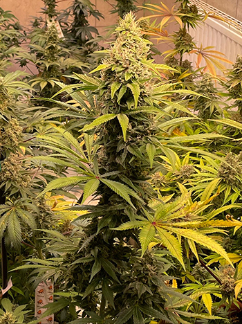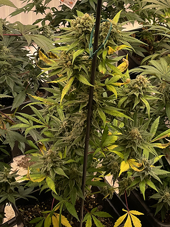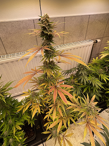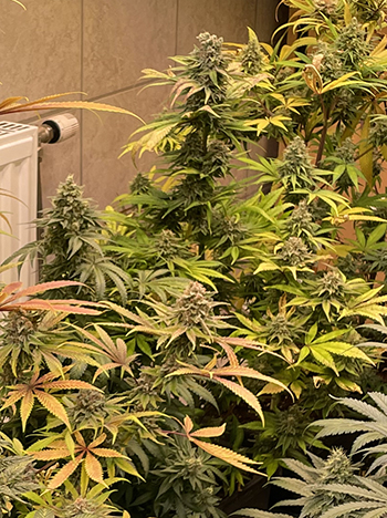 Bijna alle planten hebben nu een gele kleur. De grote schutbladeren kleuren geel en soms paars of rood. In het engels noem je dat de ‘fade‘ en in het Nederlands zouden we misschien zeggen dat de herfst is aangetreden. Als de fade begint dan zijn wietplanten aan het afbloeien, en gebruiken ze hun eigen suikers uit de bladeren, om zich nog verder mee te voeden. Dat laat zien dat de planten zo goed als klaar zijn voor de oogst.