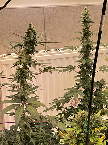 De dikste toppen zitten op de Mr.Jekyll Kush planten van Mr. Hide Seeds. Deze zijn groter dan mijn handen en zitten vol met kristallen. De Blue Mint planten van Mountain High Seeds zijn ook mooi gegroeid; ook deze buds hebben een mooie witte laag hars. De geur van deze planten is minder zoet en wat kruidiger.