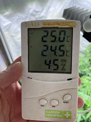 De twee EVO4-120 LED-lampen van SANlight zijn nu gedimd naar 60%. Ze hangen nog steeds op 70 cm afstand van elkaar en 11 graden naar binnen gedraaid. Ik takel ze geregeld wat omhoog, om ze op de ideale hoogte van 30 centimeter boven de toppen van de planten te houden. Op deze manier valt het meeste licht op het kweekoppervlak van 120 x 120 centimeter.