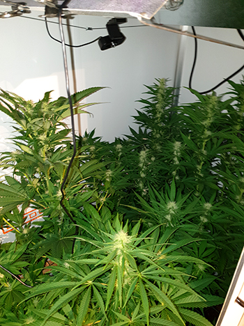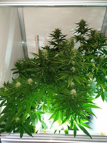 De dames in deze kweekkast zijn in de week van kerst gaan bloeien; ze zitten nu in hun vierde bloeiweek. De Sneeze heeft een bloeifase tussen de 9 en 10 weken dus er zijn nog wel wat weken te gaan tot de oogst. De Sneeze wordt tussen 80 tot 120 centimeters hoog. Mijn dames in de kleine kweekkast hebben een hoogte van 77 centimeters dus ze kúnnen nog iets groter worden de komende weken.