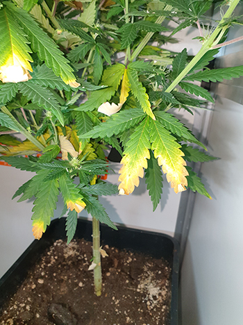 Inmiddels zijn de twee planten aardig bijgekomen, alleen zag ik dat er een paar bladeren op zijn kop gedraaid waren. Dit is geen goed teken maar kan nog zijn van teveel aan water, of omdat het te warm wordt in de kweekkast. Bij het controleren van de temperatuur hebben de dames het echter niet extreem warm of koud. De nachttemperatuur is rond de 20 graden en overdag is het rond de 29 graden in de kast. De binnenzon hangt 15 centimeter boven de planten, maar ik denk dat ik hem de komende week naar 20 centimeter verhoog. De bewatering van de dames gebeurt dagelijks, en ze krijgen dan 450 milliliter water met voeding van Plagron.