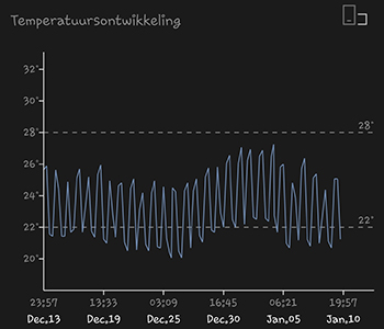 Oftewel de klimaatgegevens van de afgelopen vier weken. De 315 Watt CMH binnenzon heb ik op een hoogte gehouden van 25 centimeter. De gemiddelde temperatuur was de afgelopen weken 23,65 graden Celsius. De gemiddelde luchtvochtigheid over dezelfde periode was 51,06 procent. De bewegingen van de dames zijn nog steeds een dagelijkse hobby van me. De twee dames aan de linkerzijde krijgen 650 milliliter water met voeding van Plagron. De twee Sneeze planten aan de rechterzijde zijn iets kleiner en krijgen 550 milliliter water met voeding.