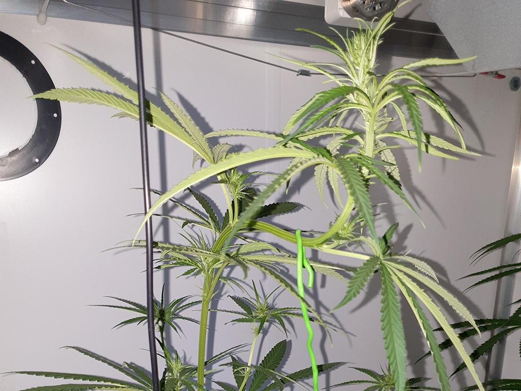 Het sativa dominante karakter en de overgang van groei naar bloei, zorgen ervoor dat Willies Morning Glory planten wat te hoog worden dan wenselijk is. Tijd voor de nodige plantentraining! In de kleinere kweekkast strekken de twee Sneeze planten inmiddels ook de hoogte in, al wordt die groei juist wel gewaardeerd.