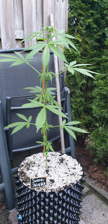 Ze staan nu 5 weken en de één (Sweet Skunk #1) begint al te bloeien, terwijl de ander (Sweet Skunk #2) nog maar een klein plantje is. Waar dit mee te maken heeft? Ik weet het niet 100% zeker maar aangezien de kweekomstandigheden (zowel de potten als de aarde zijn hetzelfde) denk ik dat het met het fenotype te maken heeft. Of een Sweet Skunk #2 moet gewoon een ’slecht’ zaadje zijn natuurlijk. Gelukkig zijn de planten een extraatje en doet de een het wel erg goed. De Sweet Skunk #1 begint namelijk zelfs al te bloeien, en daar worden we uiteraard blij van 😀