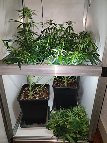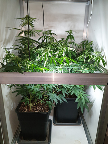 Aan de bovenzijde heb ik de takken wat beter over de oppervlakte geprobeerd te verdelen. De dames hebben samen een gemiddelde hoogte van 66 centimeter. De 150 Watt G-Bars heb ik 20 centimeter boven de twee wietplanten hangen.