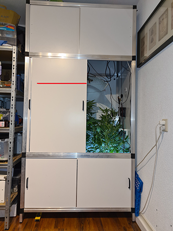 De Mohammeds zijn de oude maximale hoogte gepasseerd. Er was dan nog wel ruimte over maar het armatuur kon niet verder langs het koolstoffilter. De rode streep geeft aan waar de 315 Watt CMH in de kast hangt. Normaal gesproken had ik nu al een beetje in de stress gezeten of de dames niet te dicht bij de binnenzon zouden komen, maar dankzij de verhogingsset is die stress nu voorbij.